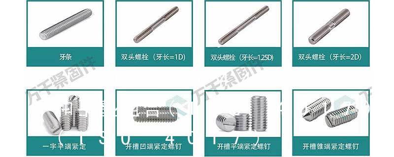 螺栓類:外六角螺栓、外六角法蘭面螺栓、內六角圓柱頭螺栓、吊環螺栓、膨脹螺栓、沉頭內六角螺栓、盤頭內六角螺絲、馬車螺栓、雙頭螺栓、蝶型螺絲、活節螺栓、地腳螺 栓、U型螺栓、四角螺栓等 螺帽類:鉚螺母、吊環螺母、六