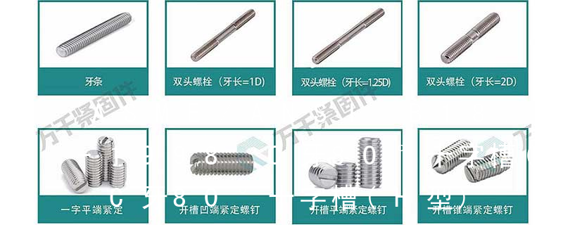 螺栓有:1、方頭螺栓,2、半圓頭方頸螺栓,3、十字槽盤頭螺釘,4、內六角沉頭螺釘,5、方螺母C級,6、蝶形螺母,7、六角頭螺栓,8、十字槽盤頭自攻螺釘。大小有M18、M6、M8、M16、M10、M12、M14、M20等型號。通常用 2、自切自攻螺釘我國標準稱為“自攻螺釘刮削端”,螺紋為自攻螺紋或機螺紋,十字槽也是“H”型。自切自攻螺釘有以下幾種型式:十字槽盤頭自切自攻螺釘,十字槽沉頭自切自攻螺釘。十字槽半沉頭自切自攻螺釘,六角頭自切自攻螺釘。
