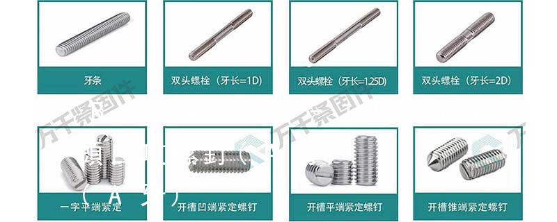 、內六角柱端緊定螺釘(柱端機米)、沉頭內六角螺釘(平杯)、半圓頭內六角螺釘(圓杯)、十字槽盤頭機螺釘、十字槽沉頭機螺釘、十字槽大扁頭機螺釘、十字槽盤頭自攻釘、十字槽沉頭自攻釘、十字槽大扁頭自攻釘、全牙